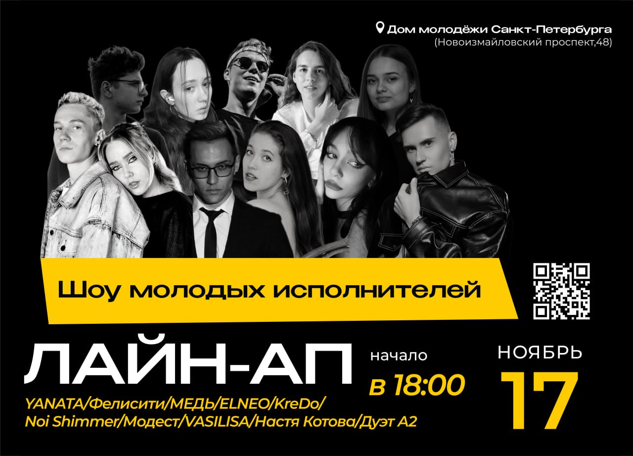 17 ноября в 18:00 на сцене Дома молодёжи Санкт-Петербурга выступят молодые звёзды Северной столицы – YANATA, Фелисити, МЕДЬ, ELNEO, KreDo, Noi Shimmer, Модест, VASILISA, Настя Котова и Дуэт А2. Их музыка – это настоящий коктейль из различных жанров: от фолктроники до поп-рока. Они не боятся экспериментировать и создавать нечто уникальное. У многих из них уже есть собственные музыкальные альбомы, популярные клипы, а гастрольный график расписан на ближайшие месяцы.